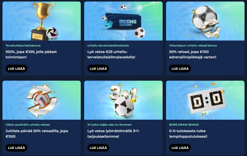 Kasinon Moana Suomi pitää pelitilin aktiivisena täysimääräisellä valikoimalla toistuvia kasino- ja urheilutarjouksia. Alla on kätevä yleiskatsaus; jokaisella tarjouksella on omat täydet ehdot kampanjasivulla.