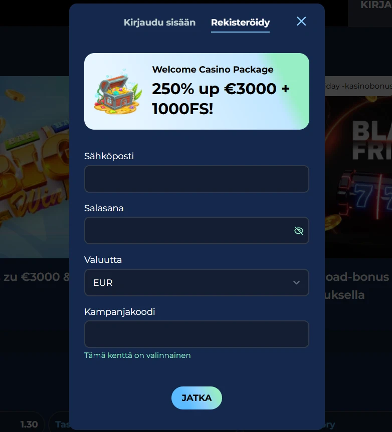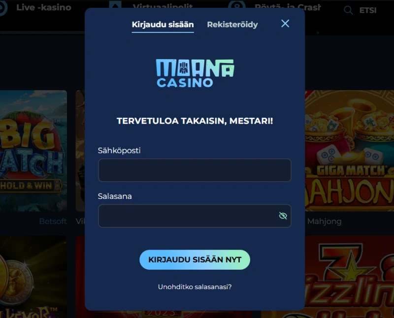 Kirjautuaksesi tilillesi, klikkaa yksinkertaisesti "Kirjaudu sisään" etusivullamme ja syötä rekisteröity sähköpostisi ja salasanasi. Jos olet tallentanut tiedot selaimeesi tai käytät laitteen biometrisiä tunnisteita (esim. sormenjälki tai Face ID), kirjautuminen mobiilissa käy entistä nopeammin.